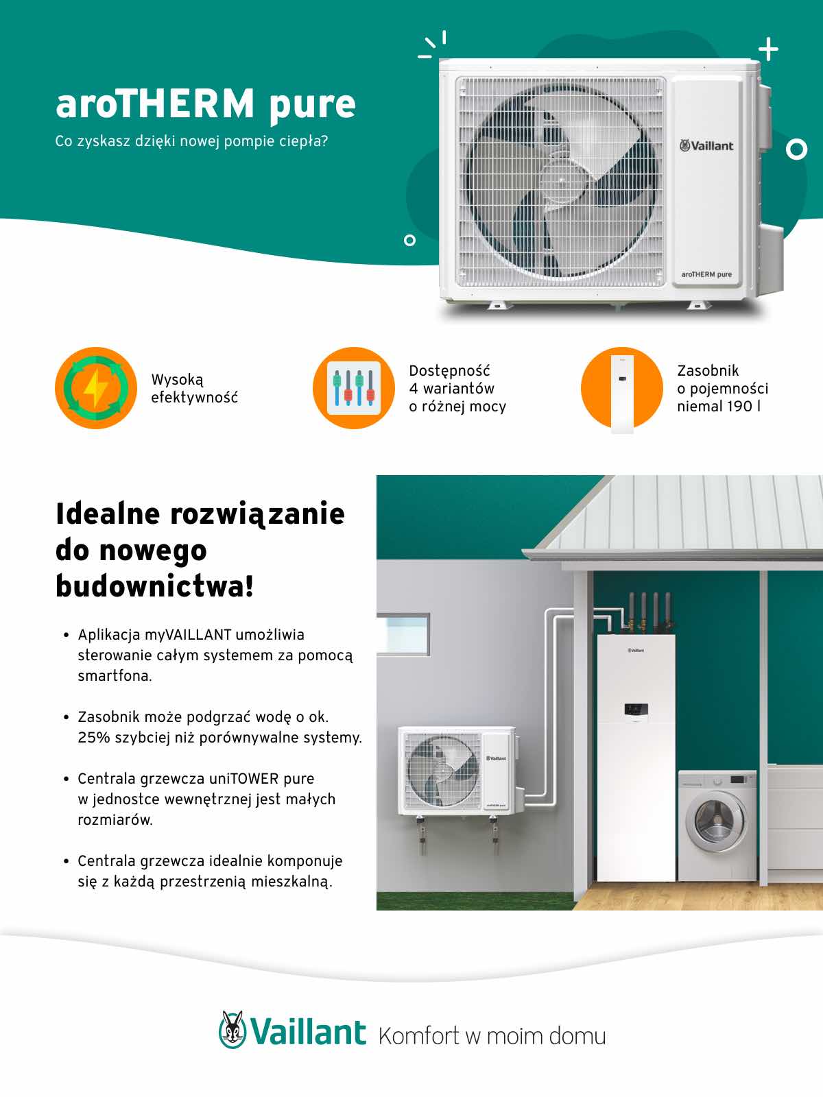 Dzięki dostosowanej mocy grzewczej i zoptymalizowanemu chłodzeniu aroTHERM pure jest pompą ciepła o podwójnym potencjale: efektywne ciepło zimą i przyjemne chłodzenie latem – nawet przy temperaturach do +48°C. Dzięki doskonałej klasie energetycznej A++ / A+++ zawsze działa ekonomicznie i spełnia surowe wymagania dotyczące efektywności energetycznej. Co więcej, system można również połączyć z instalacją fotowoltaiczną.